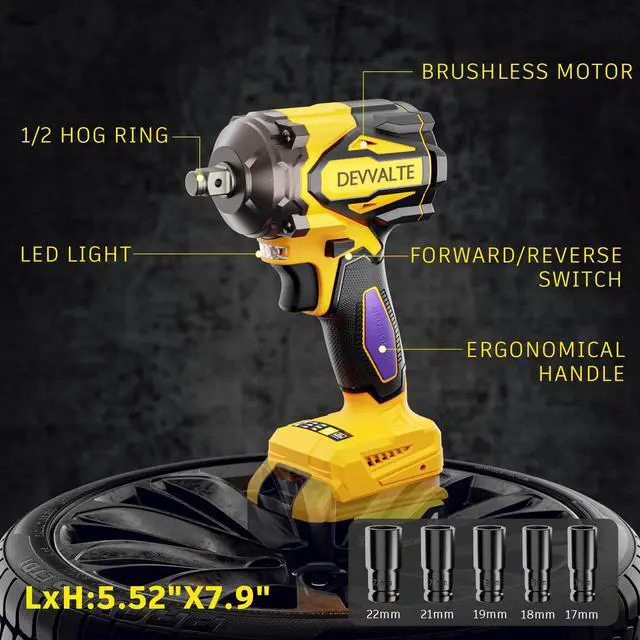 - DEVVALTE Electric Impact Wrench 1/2 Inch for DEWALT has up to 665-foot pound (900N.m) tightening torque and 738-foot pound (1000N.m) loosening torque.