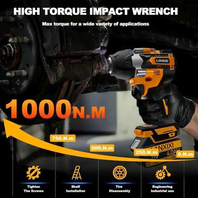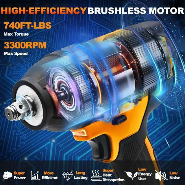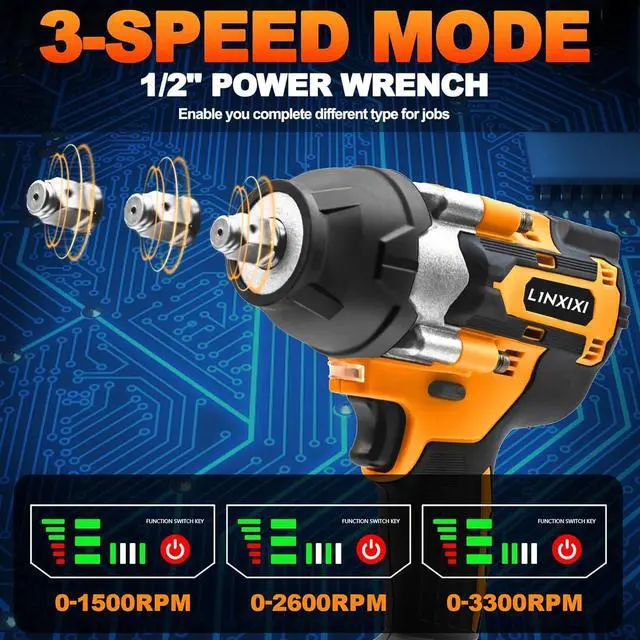 Powerful Brushless Motor: This 1/2 cordless impact wrench delivers a 740 ft-lbs (1000 N.m) high torque and supports 3 speeds from 0-1500/2600/3300RPM adjustment to meet different working demands, improve efficiency, and save battery power. Compared to traditional motors, high torque impact wrench run 1.66 times longer, are quieter, spark-free, and are easy to use.