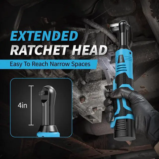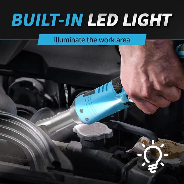 [Built-in LED Light & Extended Head]: This electric ratchet 3/8 drive features a built-in LED light to illuminate dark workspaces. Its ultra-slim 4-inch extended head reaches tight spaces easily, and includes an extra 3-inch extension bar for even greater accessibility