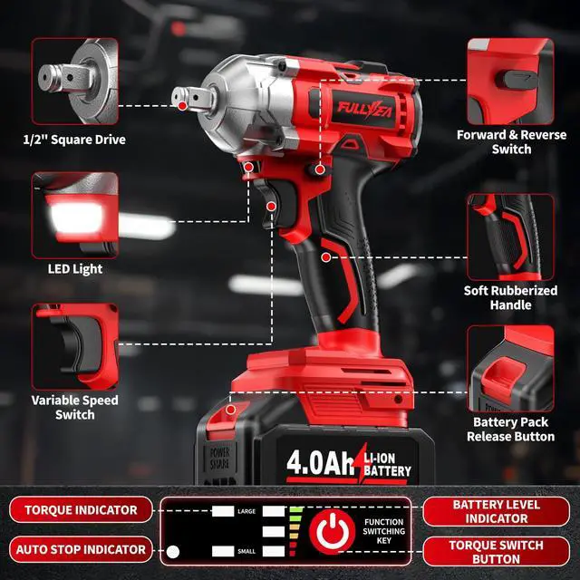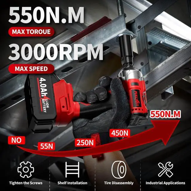 [Upgraded Impact Wrench]: FULLYEA impact drill delivers powerful performance with 406 ft-lbs (550 N·m) of maximum torque, making it capable of easily loosening or tightening various bolts and nuts. The impact driver is ideal for multiple applications including automotive work, DIY projects, home maintenance, Heavy equipment maintenance, workshop and industrial assembly work, etc
