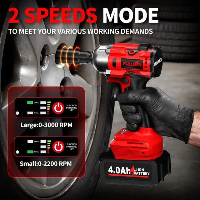 [LED Light & 2-Speed Adjustment]: The electric impact gun features a variable-speed trigger, offering two adjustable speeds (02,200 RPM and 03,000 RPM) to match different task requirementsenhancing efficiency while conserving battery life. Additionally, the built-in LED light provides clear visibility in low-light work environments