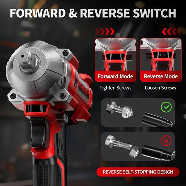 [2-Direction & Brake Stop System]: This power impact wrench features both forward and reverse modes. When in reverse rotation, the brake stop function automatically engages once the nut or bolt is loosenedsimply press the switch button to activate it. This prevents the nut from falling off and getting lost