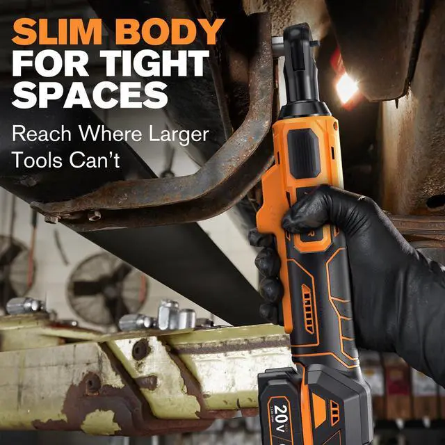 & : Weighing only 2.5 lbs with a slim 3/8" head, this cordless ratchet slips into tight engine bays, under dashboards, and other hard-to-reach spots where bulky tools and air ratchets struggle. Just pull the trigger and let the motor spin the fasteners, helping you finish jobs faster and with far less effort than a manual ratchet, while its compact size stores easily in your toolbox, drawer, or trunk.