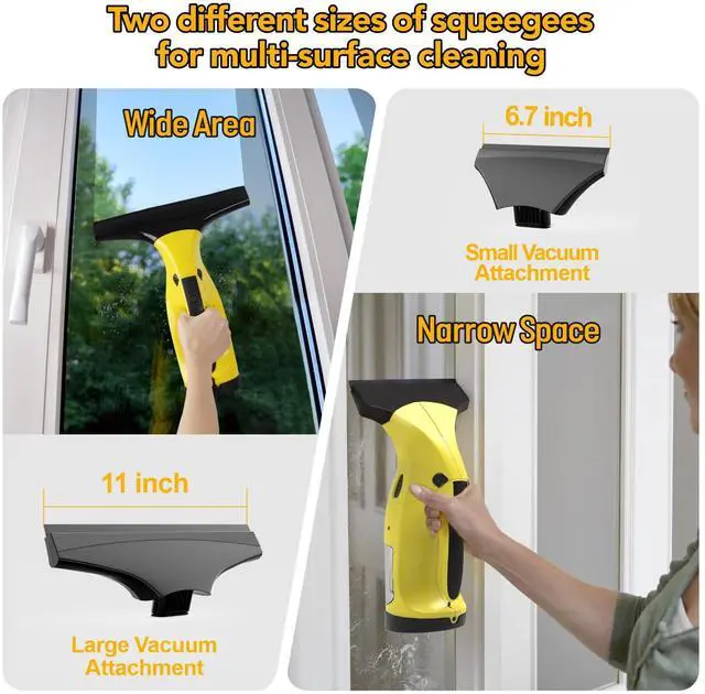 EAVE window vac comes with a large 11-inch squeegee blade for cleaning wide areas and a small 6.7-inch squeegee blade for cleaning tight spaces.