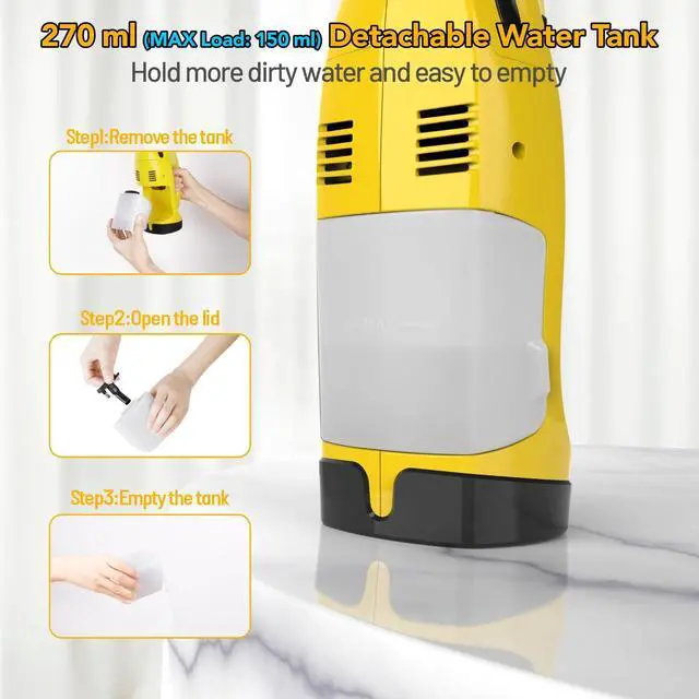 The 270ml (MAX Load: 150 ml) detachable water tank can hold more dirty water and do not need to empty that often.