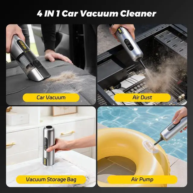 4-in-1 VersatilityThis car vacuum combines vacuuming, blowing, inflating, and deflating with convenient accessories. It clears dust from car crevices or keyboards, inflates air mattresses/pool floats, and seals storage bagseasily meeting home, car, and outdoor needs