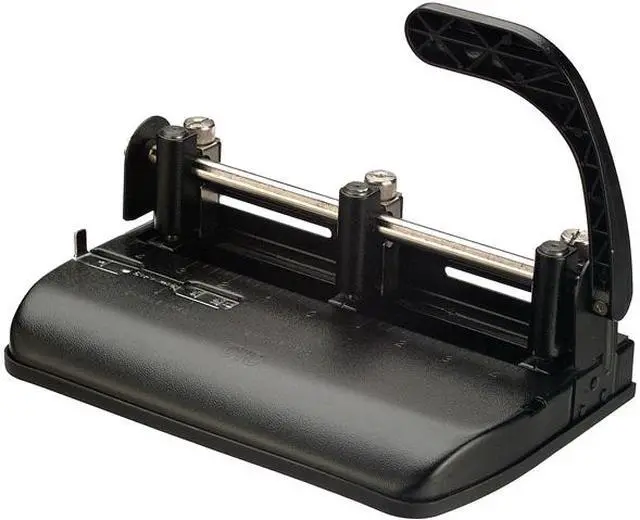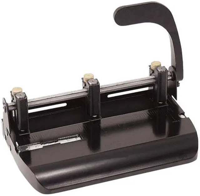 Heavy-duty hole punch features an ergonomic lever handle for easy punching of 9/32" holes in up to 32 sheets of 20 lb. paper. Three adjustable punch heads deliver 2-hole or 3-hole punching. Design also features an adjustable paper guide and easy-to-empty chip tray. Jam-free hole punch offers an all-metal construction for durability. More from the Manufacturer