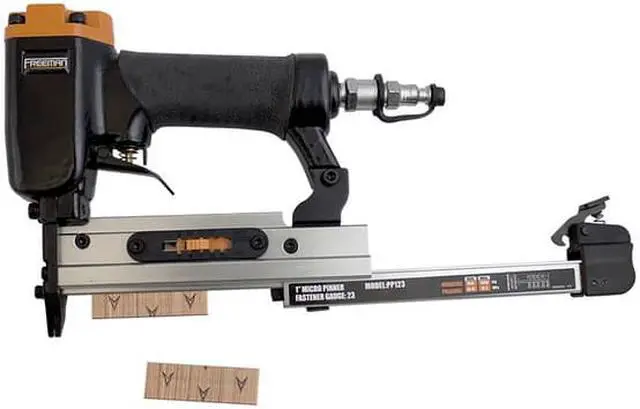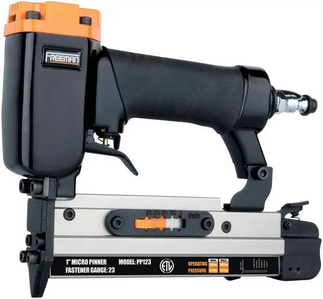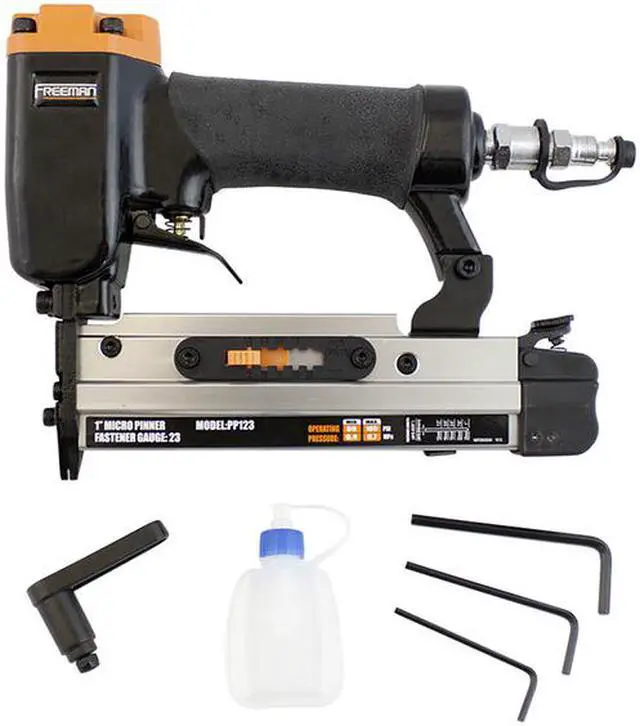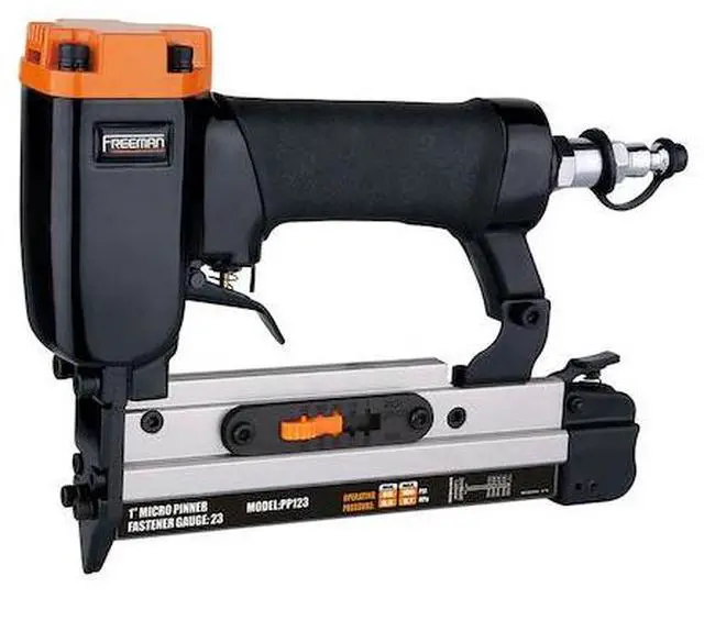 The Freeman PP123 23-Gauge 1 in. Headless Micro Pinner is a woodworker's dream come true. The headless micro pinner is extremely lightweight and easy to handle. It utilizes 1/2 - 1 in. pin nails and can be used for all types of hobby work, jewelry cases, detailed trim, and custom work. The Freeman pinner is extremely durable and precise featuring an anodized aluminum magazine and cylinder, Teflon O-rings, a pin size selector, and a dust cap to increase performance and durability. Freeman combines affordable pricing with high quality products for the ultimate value in a tool.