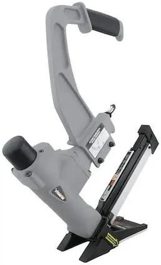 California Proposition 65: This product contains a chemical known to the State of California to cause birth defects or other reproductive harm. The NuMax SFL618 Pneumatic 3-in-1 15.5 -Gauge and 16-Gauge 2" Flooring Stapler and Nailer is designed for the installation of tongue and groove hardwood flooring. This air powered flooring nail gun and stapler is compatible with 16 gauge T-cleats and L-cleats and 15.5 gauge 1/2" crown staples from 1-1/2" to 2" for all three types of fasteners. Two interchangeable no mar base plates allow you to install 1/2" to 3/4" flooring while protecting finished flooring surfaces, ensuring professional results for DIYers tackling home improvement and repair projects as well as construction contractors at the job site. Durably constructed of die cast aluminum and heat treated steel parts, this tool is both rugged and lightweight. The ergonomically designed handle has a rubber grip, providing for additional ease of use during long shifts. Recent upgrades include a smaller tool body, a semi-quick release for easier access to the drive blade to clear jams, a magazine cover for smooth fastener feeding, and an improved base plate design. The value provided by the revolutionary design of this innovative tool comes at far less expense than three separate tools.