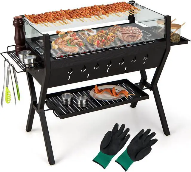 User-Friendly Design: The removable bottom storage rack and side seasoning racks with hanging rod make your tools and seasonings well-organized. And the convenient handles make it easy to detach the fire bowl when finishing the BBQ.