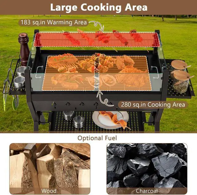 Sufficient Grilling Space: With 280 sq.in. grilling area and 183 sq.in warming area, this charcoal grill is always ready to provide freshly grilled goodies. And the food grade 304 stainless steel grilling grates are rustproof and heat resistant for long use.