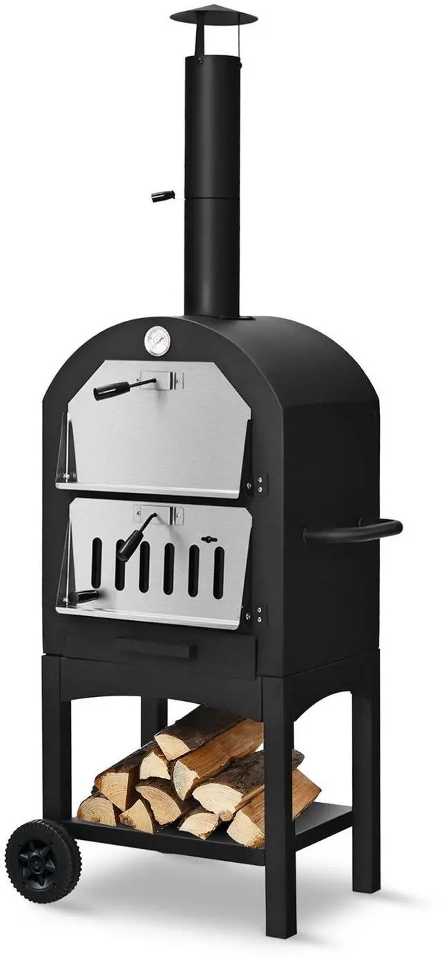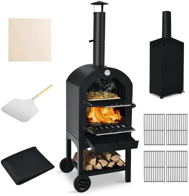 Description: Able to reach a temperature up to 662°FPerfect for making 12-inch pizza burger baked fish and roast meatNice choice for picnic family gathering BBQ party or campingShovel of the door or chimney to adjust fire and smokeDual thermometer displays interior temperature2 flexible PP wheels for easy movement2 stable steel legs and solid frame stay steady on the groundEasy-to-grip handle for convenient holdingWaterproof oxford fabric cover makes it suitable for outdoor usePull-out ash collector for easy cleaningMesh storage shelf to place woodPizza peel helps you to take out pizza easily and safelyClear user manual ensures easy assemblyPackage included: 1 x Outdoor pizza oven 1 x Waterproof cover 1 x Pizza peel 1 x Pizza stone 1 x User guide Installation guide