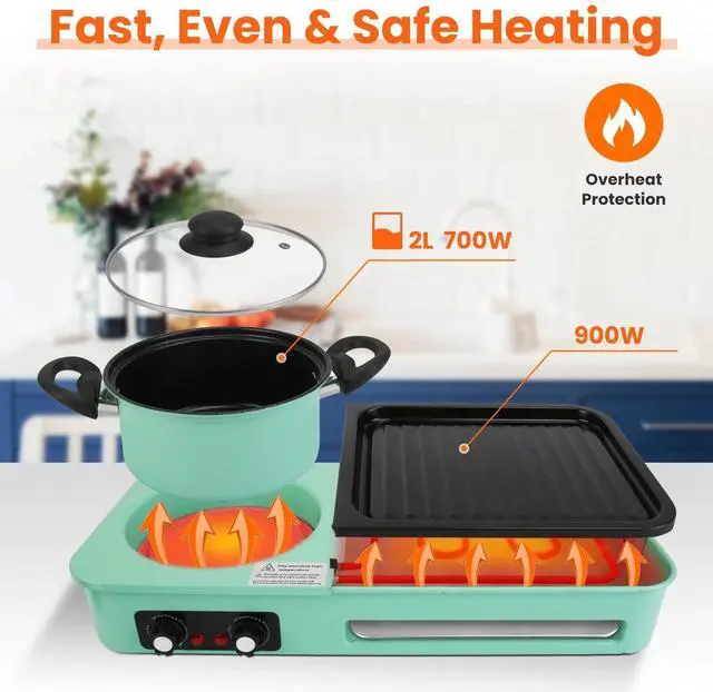 Fast,Even & Safe Heating:Equipped with premium heating tubes,our 1600W powerful electric grill with hot pot heats up quickly and evenly,ensuring every bite is delicate and delicious while also minimizing the waiting time. Furthermore,overheating protection will auto shut down this grilling pan after temperature reaching too high,preventing safety hazards.