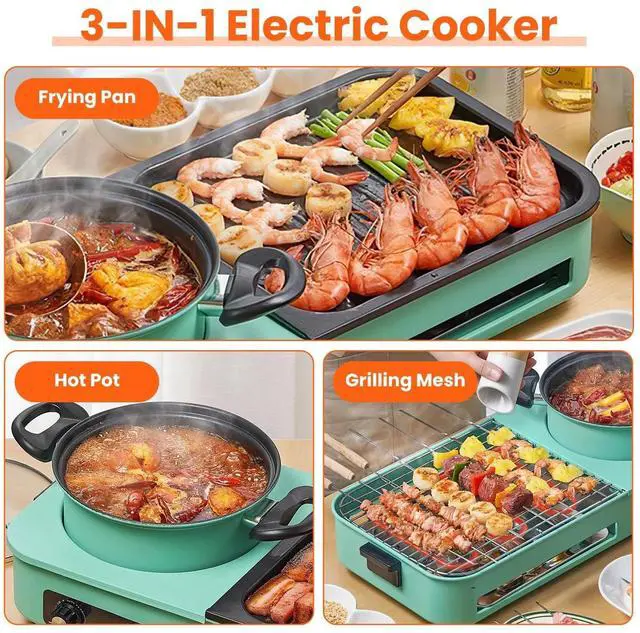3-In-1 Hot Pot With Grill & Fry:Come with hot pot,grilling mesh and frying pan,this multifunctional electric cooker allows you to enjoy distinct flavors of delicacies at the same time. Suitable for 3-5 people gathering,our electric hot pot with grill caters to all your desires. Whether you want to enjoy teaming hot pot filled with savory soup,or grilled meats and vegetables,or even crispy texture of fried foods.