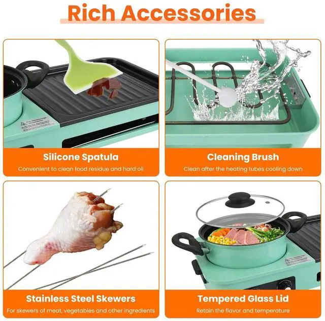 Rich Accessories For Easy Cleaning:Hot pot and grill pan can be separated from the electric body,innovative detachable design makes cleaning easier,dishwasher safe. We also provide cleaning brush and silicone spatula to clean the heating tube.