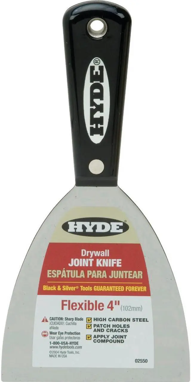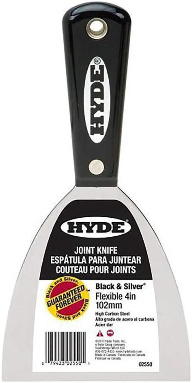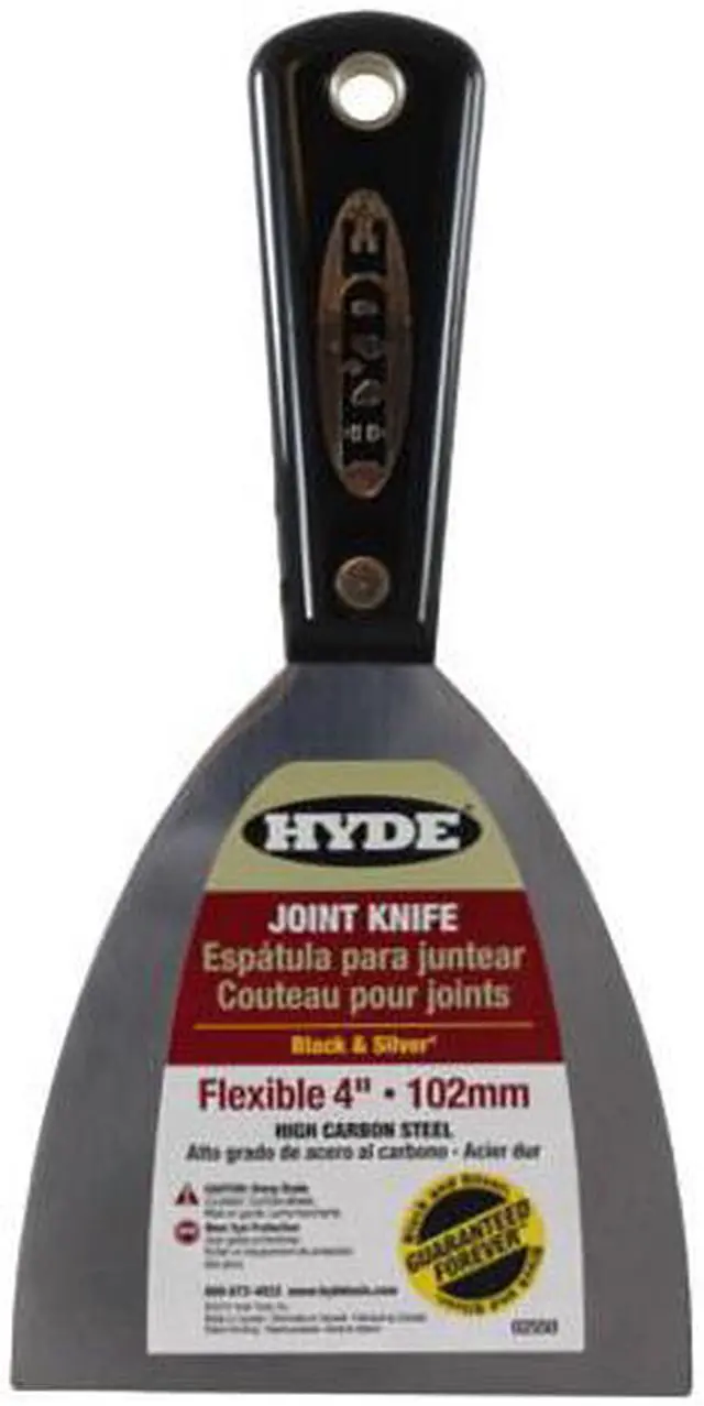This Hyde 02550 Joint Knife is an essential tool for any professional. It has a nylon handle and full-tang blade that is guaranteed forever. The blade of the flexible joint knife measures 4 in. in width and 4 1/4 in. in length, while the overall length of the tool is 8 in. The carbon steel blade ensures durability, while the black/silver color makes it easy to identify when you're working on your project. Designed with a 3 3/4" nylon handle, this product has a standard blade type and application for applying and smoothing compound and taping joints.