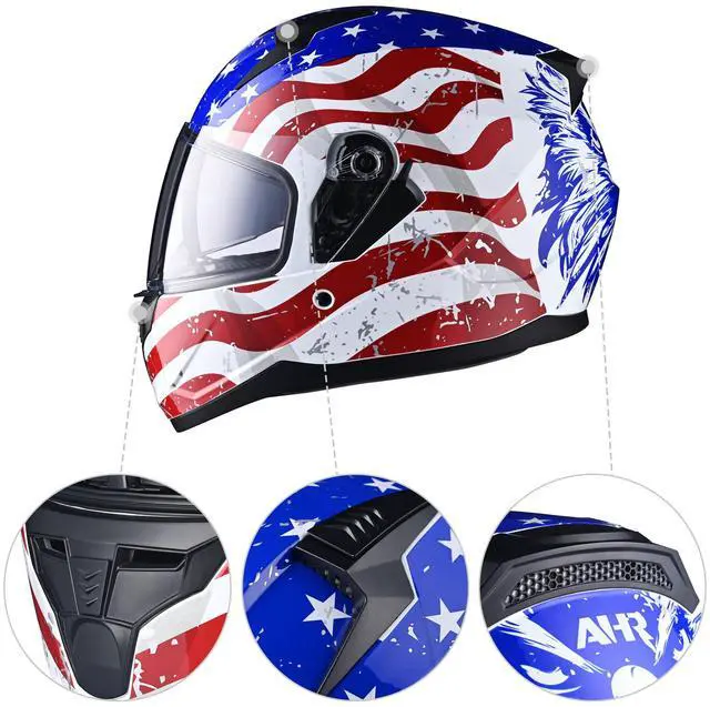 - Show Your Patriotism - AHR RUN-F Full Face Motorcycle Helmet features Old Glory Design with Stars and Stripes and an eagle pattern for symbolizing American power, showing your spirit of patriotism and independence, along with unique white paint splatters for enhancing artistic appeal, giving you a sense of freedom while youre riding with your loved one and buddies and promoting your intimate relationship
