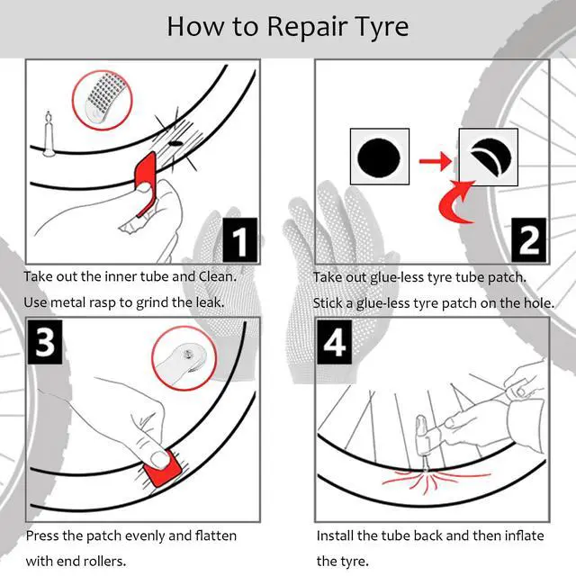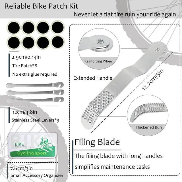 Reliable Bike Patch KitNever let a flat tire ruin your ride again. Our kit contains 3 stainless steel levers and 8 self-adhesive patches for quick and hassle-free repairs. The filing blade with long handles simplifies maintenance tasks, making patching effortless. No extra glue required just sand, clean,firmly apply the patch and flatten with end rollers.