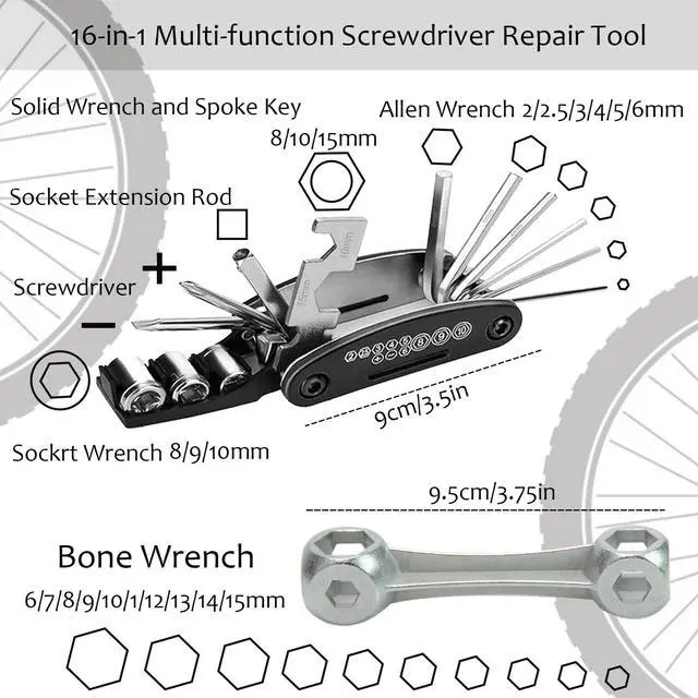 Comprehensive Bicycle Repair KitBe ready for cycling mishap with our all-inclusive repair kit. Includes an aluminum alloy mini pump, trachea, screws, tire patch, filing blade with long handles, stainless steel levers, bone wrench, expansion valve, needle valve, air regulating valve, and a 16-in-1 bike wrench set for on-the-go repairs.