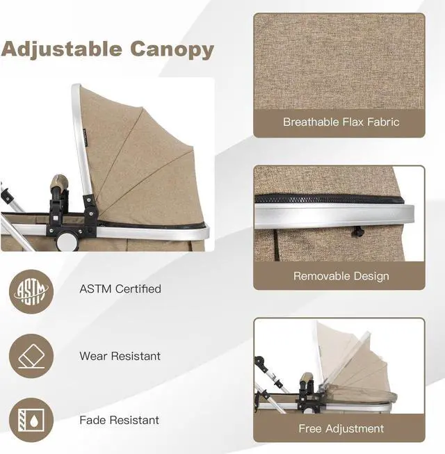 Heavy-duty Materials: The aluminum alloy frame is lighter than iron (or steel, copper) and will never rust so you can use it longer. The wearable non-toxic and breathable linen can well-protect your babies from rains or harmful rays.