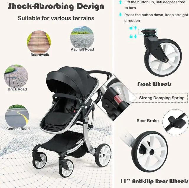 2-in-1 Functional Design: This infant stroller features 3 reclining positions, not only creating a cozy sleeping space as a bassinet pram, but also providing awesome view for baby to enjoy the outside world as a pushchair. And the stroller can be reversed both inside or outside to satisfy different demands of you and your little one.