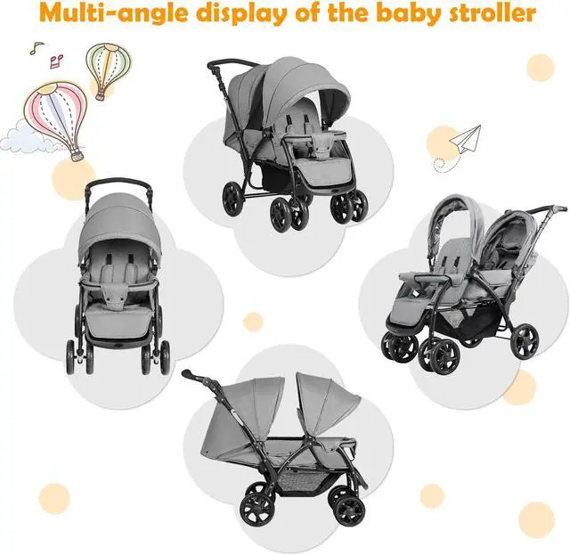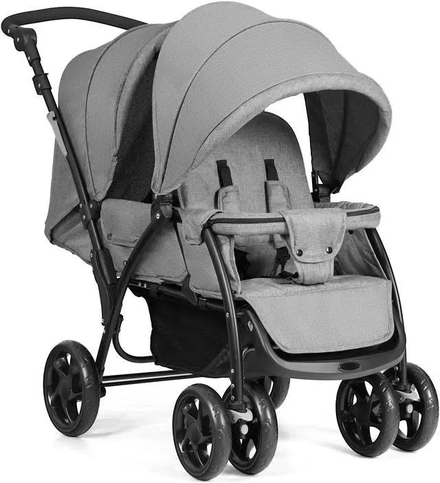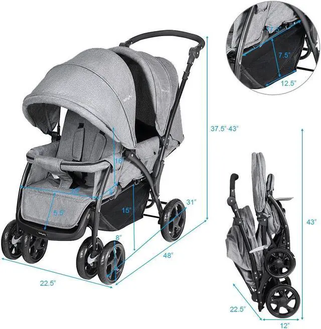 Double Seat Design: Designed with 2 seats in front and back fits two babies seat together. The front seat is suitable for baby of 6-36 months. Rear seat is suitable from birth to 36 months. The maximum load of the stroller is 33 lbs in each seat.