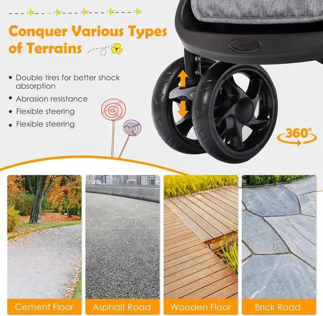 -Front shockproof wheels and rear linkage brake wheels for much safety for the baby