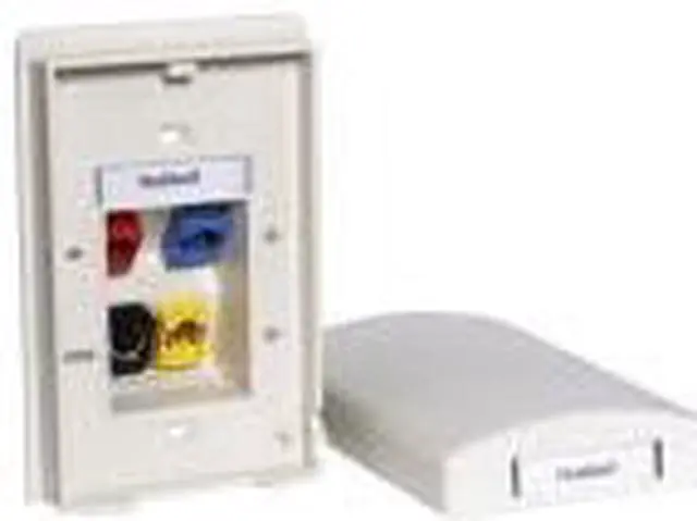 Wall Plate, Product Type Wall Plate, Color Office White, Compatible Connector Type Keystone Jack Modules, Number of Gangs 1, Outlet Orientation Vertical, Number of Ports 4, Compatible Cable Performance Category Not Applicable, Resistance Properties Tamper Resistant, Material Plastic, Features Staggered and Angled Opening, Includes Cover, Includes Mounting Hardware Yes, Overall Depth 1 7/8 in, Overall Height 5 1/8 in, Overall Width 3 3/8 in. This item has been restricted from sale in the following state (s): []