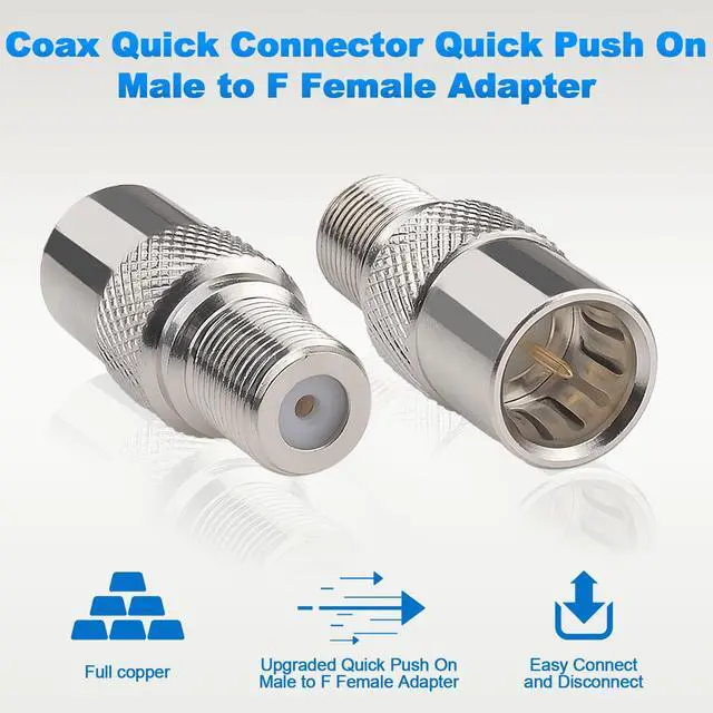 HIGH QUALITY: We have upgraded this Quick Push On Male to F Female Adapter, This F Type connector is a redesigned new model, the appearance is different from the market, the Quick Push plug there is to do an upgrade, Male side not easy to falling apart,you can check the designed of Quick Push On Male. and the material of our products is full copper, I studied the others review of the customer, the others connectors were falling apart easliy might be material is zinc alloy