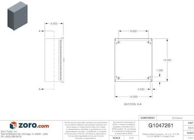 Enclosure NEMA Rating 1, Material of Enclosure Carbon Steel, 12 in, Hinged Enclosure Cover Type, Solid / Clear Cover Solid, Closure Method 1/4-Turn Latch, Finish ANSI 61 Powder Coated, Color Gray, Depth 6 in, Enclosure Cover Features 1/4 Turn Latch Flush Mount, Features Grounding Provisions, Mounting Holes, Height 14 in, Interior Panel 2W823, Metal Gauge 14 ga, Wall Mounting, Series N1C, Standards CSA Certified, cULus, UL Listed, Usable Opening Depth 5.88 in, Width 12 in. This item has been restricted from sale in the following state (s): []