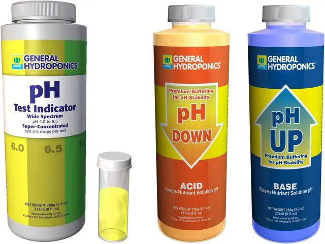 PH control kit Contains Ph Up, Ph Down and Ph Test indicator Add a little Ph Up at a time when your nutrient pH is too low in order to raise the pH to the proper level Ph Down uses food grade Phosphoric acid to lower the pH to the proper level Ph Test Indicator is added to the test tube with the nutrient and observe the coloration of the liquid in the test vial Use 3 drops per 5mL of solution 1 fl oz.