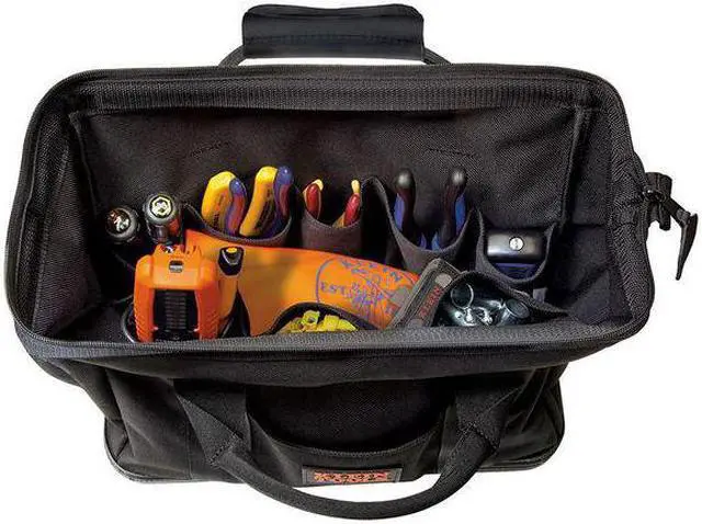 California Proposition 65: This product contains a chemical known to the State of California to cause birth defects or other reproductive harm. The Klein Tools 15-Inch (381 mm) Tool Bag is built of heavy-duty Cordura® fabric, a high-performance material resistant to abrasions, tears and scuffs. It has eight interior and two exterior pockets to hold a wide assortment of hand tools and supplies. Molded bottom made with a durable impact modified polypropylene. Made of Cordura® fabric, a high-performance material resistant to abrasions, tears and scuffs. Molded bottom made with a durable impact modified polypropylene. 8-interior and 2-exterior pockets hold a wide assortment of hand tools and supplies. Large opening with reinforced steel frame maintains the bag's shape while loading and unloading. Heavy-duty nylon zipper closure and large leather zipper-pull assure easy operation. Box-stitched handles and D-ring shoulder strap mounts for extra strength and long life. Optional padded slip resistant adjustable shoulder strap (Cat. No. 58889) for hands free mobility. Cordura® is a registered trademark of INVISTA for durable fabrics.. This item has been restricted from sale in the following state (s): []