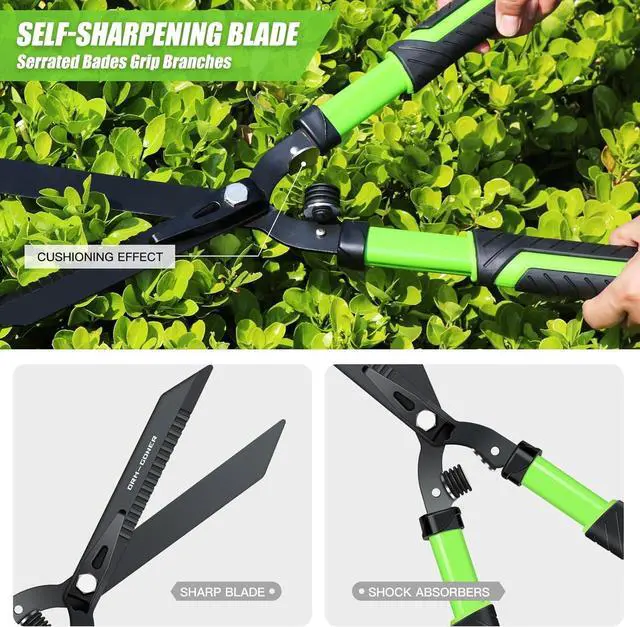 New Tech Hedge TrimmerOur new serrated blade hedge clippers handheld undergoes multiple processes such as heat treatment, electroplating, and coating to ensure smooth cutting and enhance rust resistance. It provides more power for each cut, while also protecting the health of your plants. No more worrying about the blades of your pruning shears getting dull after a few cuts