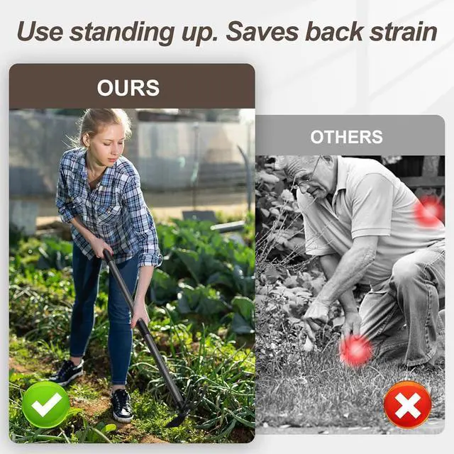 No Bending Need: 45 Inch long overall. This hoe garden tool long handle handle is ergonomically designed to reduce the pain in joint caused by the bending of your back when doing yard work.