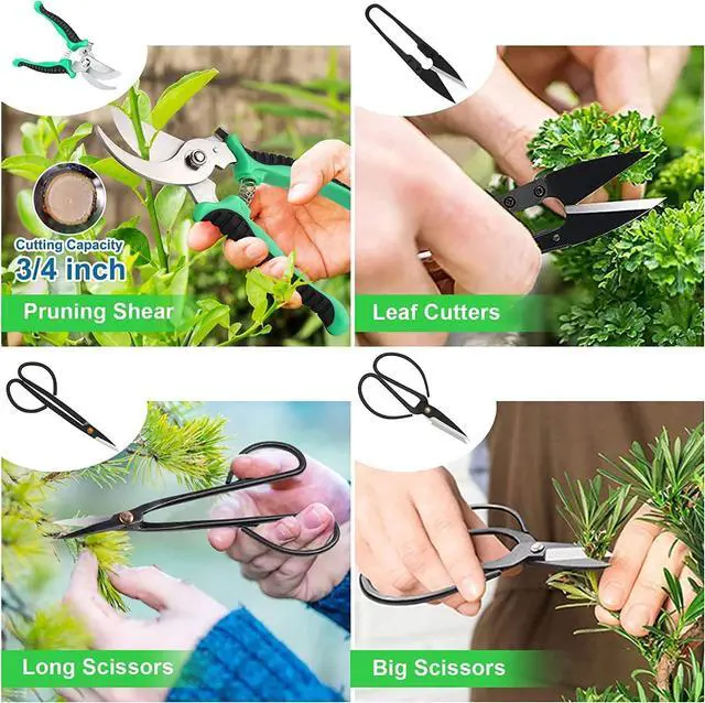 High Quality Material: The bonsai scissors and long handle scissors is made of high-carbon steel, It' s stronger, sharper and more durable than aluminum blades and stainless steel blades. It' s suitable for quick cutting of bonsai and other plants such as hairless, pruning and shaping. Meanwhile, It' s suitable for cutting steams and light branches, can cut up to 3/4' ' diameter size, which may depending on the tree species. Gently wipe clean after each use Oil will make them last for a long time