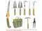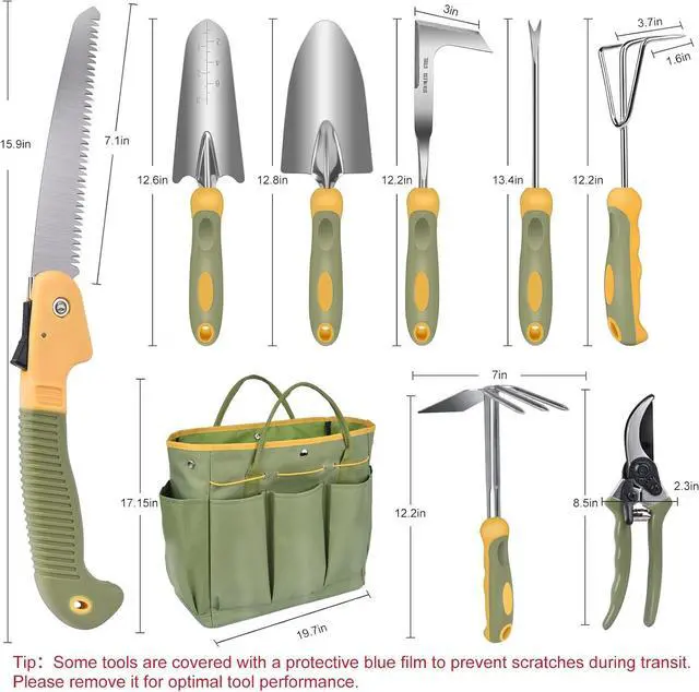 What You Get9-Piece Green garden tools set: Dual-purpose hoe, hand Rake, hand weeder, transplanter trowel, folding saw, pruning shears, garden trowel, crack weeder and garden tote storage bag. Nearly everything you need in daily garden maintenance. The ideal garden gift set for those who love outdoor gardening.