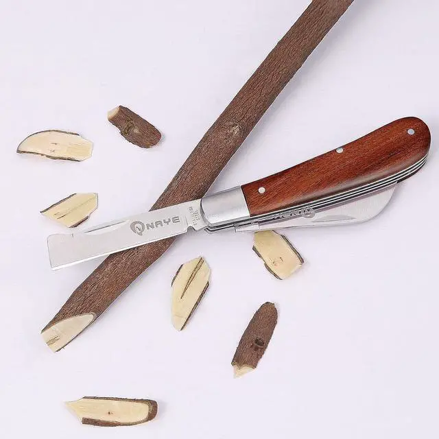 Razor sharp curved/straight two blade pocket grafting knife. Ideal for use with grafting trees and flowers and also for gardening use. The double blade Garden/Grafting Knife has a CURVED BLADE and a STRAIGHT BLADE with BARK LIFTER