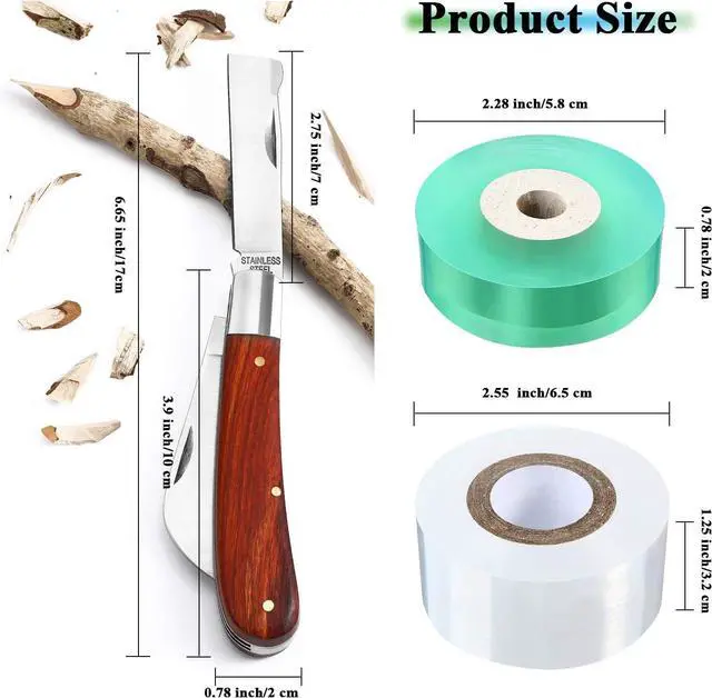 Dimensions and specifications: the blades is approx. 7.9 cm/ 3.1 inches and the handle is approx. 10.2 cm/ 4 inches long, the white grafting tape measures approx. 3 cm/ 1.2 inches in width and and the green one measures approx. 2 cm/ 0.8 inches, each roll of tape is about 131 yards, 2 sizes and long enough to meet your requirements