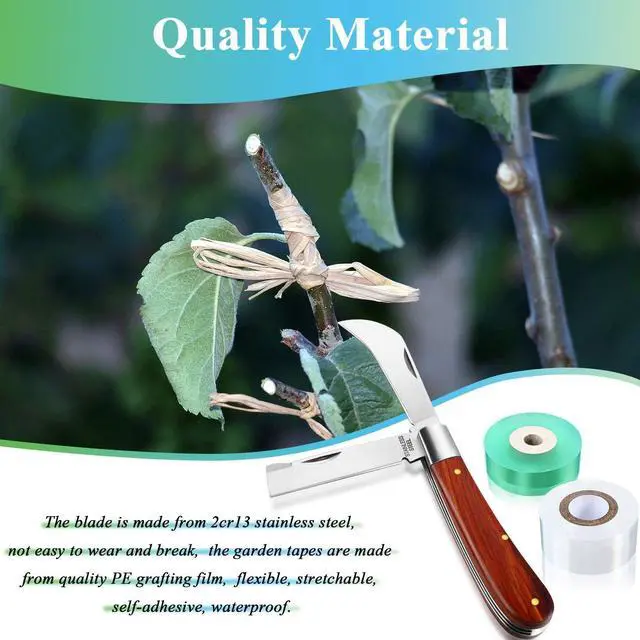 Quality material: the blade is made from 2cr13 stainless steel, and gardening knife handle is made of wood, stainless steel blades are pointed, not easy to wear and break, the handle is comfortable to hold, and garden tape is made from quality PE grafting film, which is flexible, stretchable, self-adhesive, waterproof, sufficient quantity for long time to use