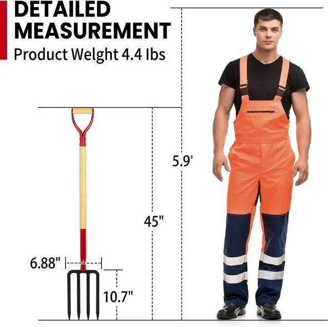 Dimension: The heavy duty garden fork has an overall length of 45 inches and weighs 4.4 pounds, the ideal length and weight for adult use.