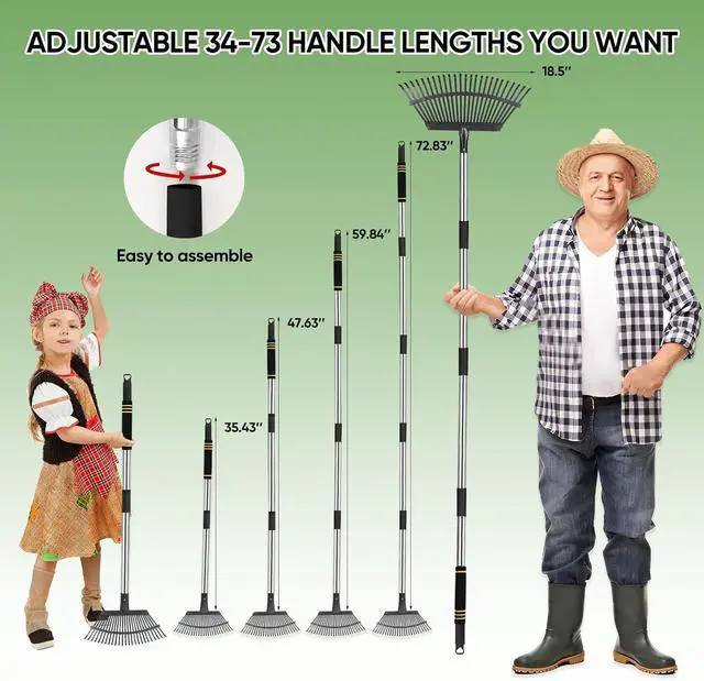 Adjustable & Detachable Handle for All Users: The adjustable handle can be customized to fit any height (from 35.43 to 72.83 ), while the quick-release mechanism allows easy disassembly for storage or transport. Perfect for families, gardeners, or anyone needing versatile rakes for lawns or rakes for leaves.
