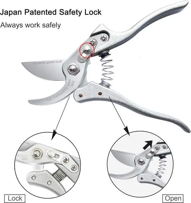 [ JAPAN PRECISION SAFETY LOCK ] - The garden clippers secateurs have been improved the safety lock with a tight clip. No matter the garden scissors work in which mode, the locking button will stay tight and will not slide easily.
