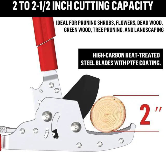 [4-GEAR RATCHET MECHANISM EFFORTLESS CUTTING] The high-performance ratcheting lopper is engineered for effortless cutting. The innovative 4-step ratchet system allows you to slice through thick, dry branches up to 2.5 inches in diameter without straining your hands. This makes it ideal for hardwood, dead wood, and dense vegetation, significantly reducing hand fatigue and improving cutting efficiency.