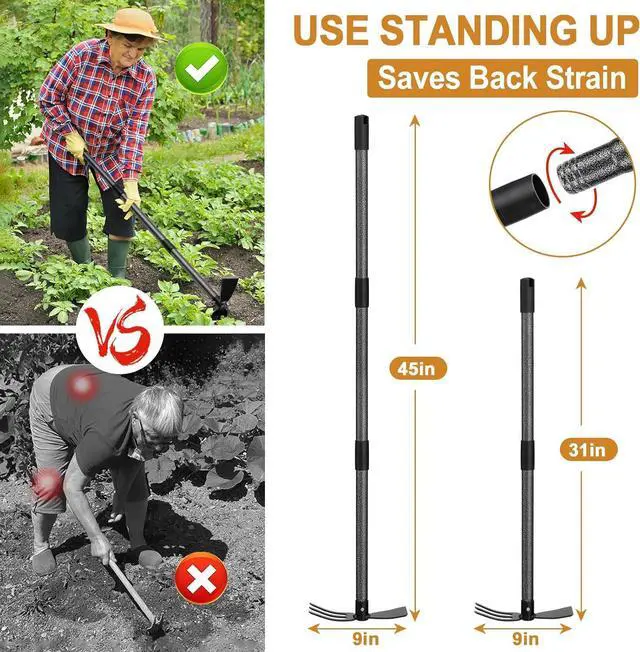 Long Handle for Standing Gardening: Our Multi-Use Garden Hoe handle length can be adjusted to 31" or 45" to accommodate gardeners of different heights. The ergonomic handle can help protect your back and waist by reducing the need to bend. The long handle and help reach hard places. Length adjustment is quick and easy, just add or remove extension rods!