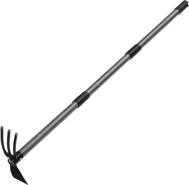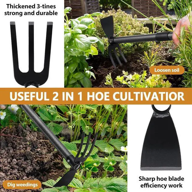 Gardening Tool: This 2 in 1 garden hoe cultivator combo is constructed with sharp hoe end and tiller end with 3 steel prongs. The hoe blade is sharp enough for digging out dirt or chopping up small tree roots, meanwhile, the tiller end is strudy enough for stirring up the dirt and removing grass or weeds. This multifunctional weeding tool helps save much time on gardening.