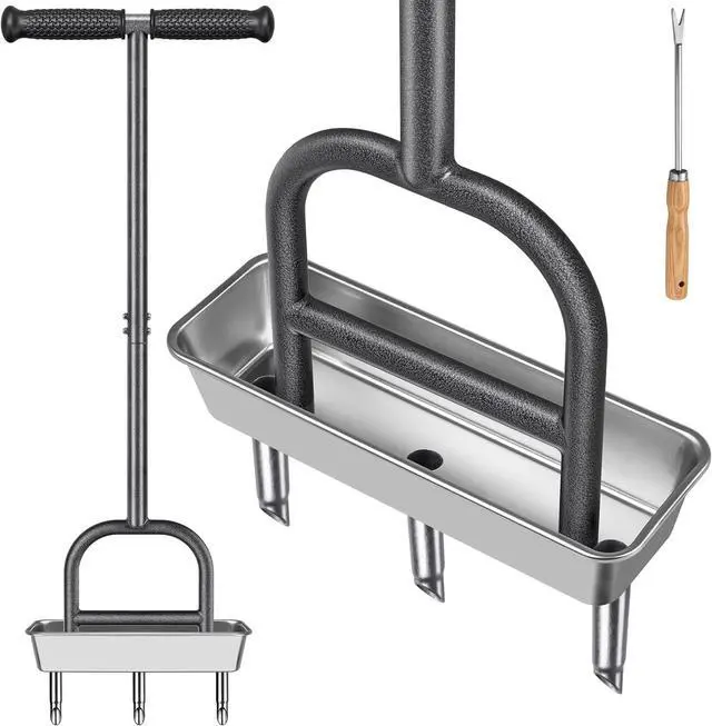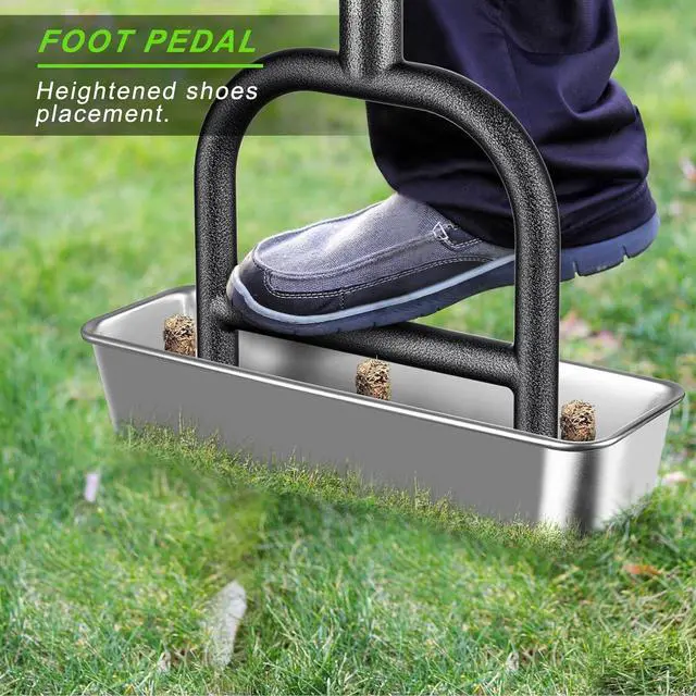 Stainless Steel Soil Core Storage Tray: The soil storage tray of this manual grass aerating tool is made of SUS 304 stainless steel, which prevents rust and deformation. The container design allows for automatic collection of the ejected plugs, saving you time and effort in cleaning the lawn.