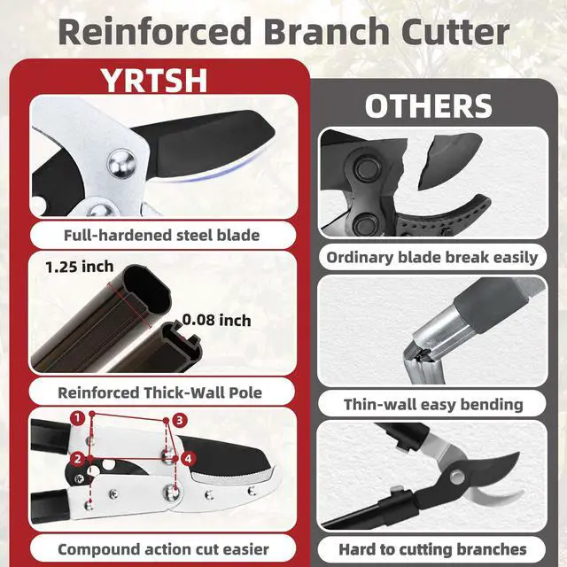 | Blade Material | The blades of the hedge clippers, lopper, and pruning shears are made from precision-ground alloy steel, ergonomic non-slip rubber grips, reinforced aluminum alloy telescopic handles of both the loppers and hedge shears |