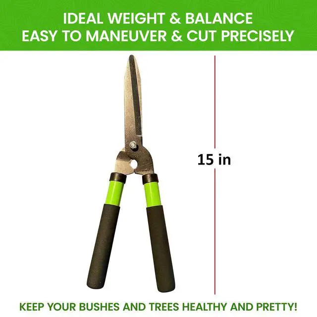 CUT, TRIM & PRUNE: With these 15 inch hedge shears, cutting your branches, hedges, shrubs, bushes, boxwood, plants, flowers and trees is easy, thanks to High Carbon Steel Blades and Comfortable Grips. Keep your bushes and trees healthy and pretty!
