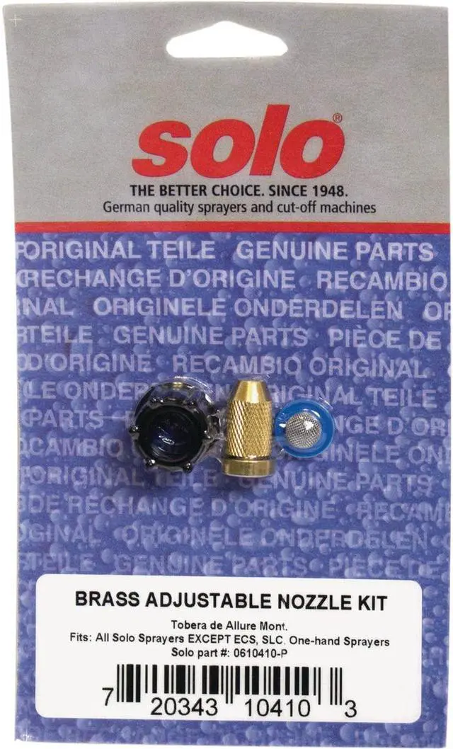 Replacement adjustable brass nozzle kit. Contains a brass nozzle and O-ring. Fits all Solo sprayers.