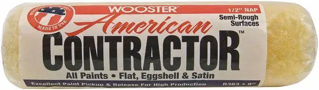 Wooster American Contractor Knit Fabric Roller Cover - First choice for value and performance in a production cover, excellent paint pickup and release. Made in America quality, use with all paints (flat, eggshell, and satin). Green double-thick polypropylene core resists water, solvents, and cracking. - Length: 9 In., Nap Size: 1/2 In., Surfaces: Semi-Rough, Core Type: Standard, Polypropylene, Material: Knit, Interior/Exterior: Interior/Exterior, Pkg Qty: 1, Package Type: Sleeve